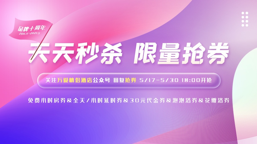 5/30前在萬(wàn)愛(ài)官方公眾號(hào),每天18:00點(diǎn)秒殺福利券,免費(fèi)小時(shí)房/花瓣浴/泡泡浴/30元券/全天房延時(shí)券/小時(shí)房延時(shí)券,限量300張,每個(gè)手機(jī)號(hào)僅可參與一次,100%中獎(jiǎng),先到先得手慢無(wú)哦。