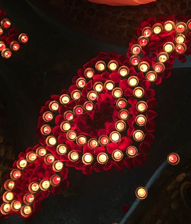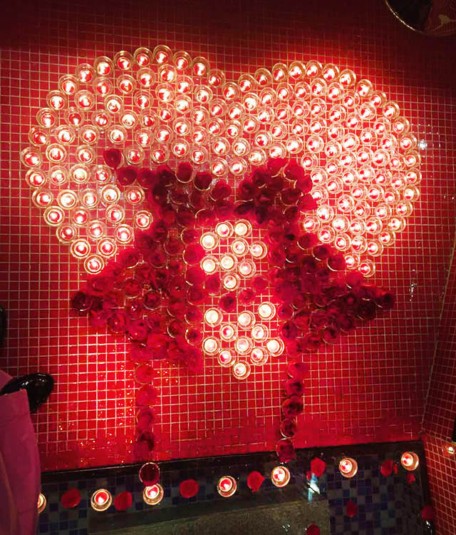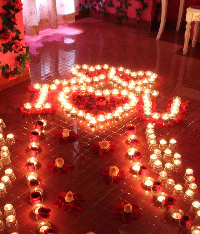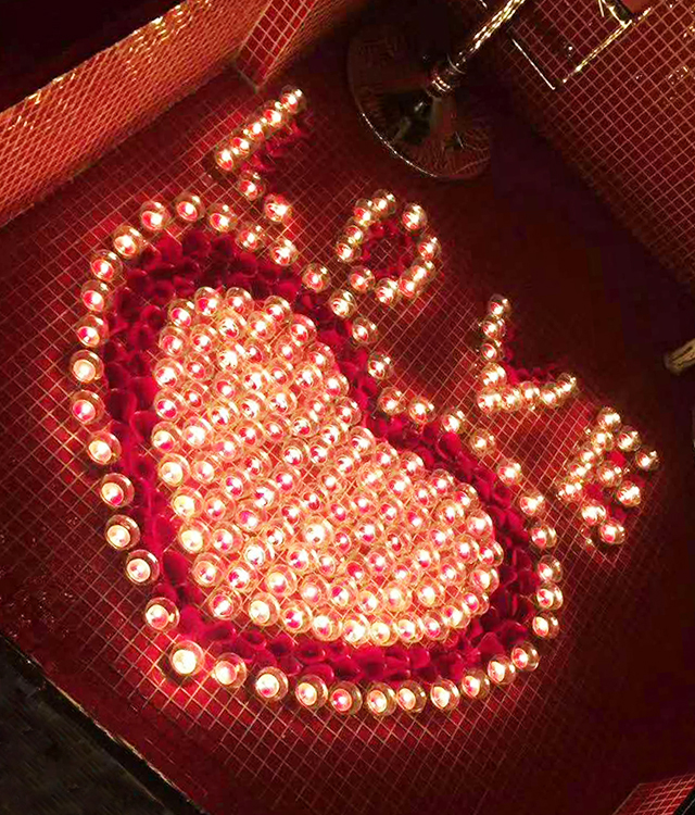 布置材料:蠟燭60-65個(gè)和鮮花3枝或蠟燭20-25個(gè)和鮮花6枝
